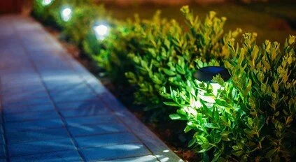 Moving out from your home is the second ring of security – path lights and down lights to porches and patios. Path lights help illuminate walkways and help to keep people from accidentally bumbling into your landscaping. Up lights can be used to shine up into trees. Flood lights can be used to illuminate large areas.
